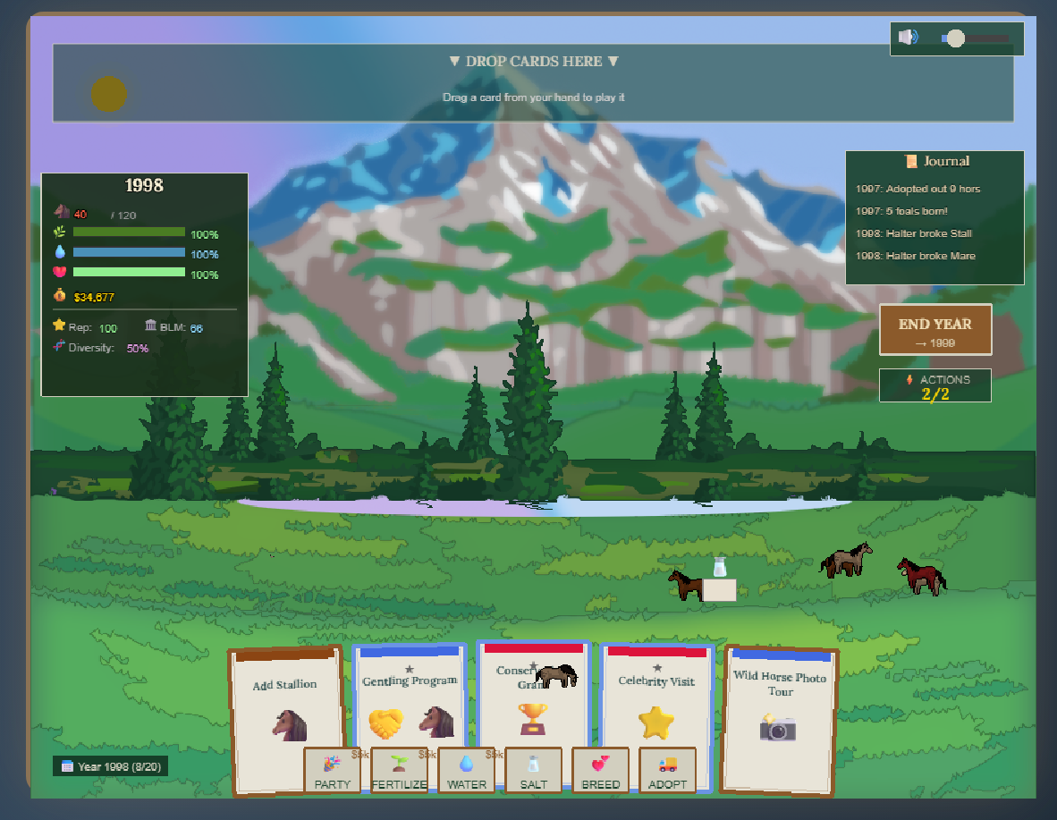 In Pocket Mustang Preserve, you step into the role of a dedicated ranger managing this sacred herd, set against the Bureau of Land Management (BLM) the federal agency tasked with overseeing America's wild horses under the 1971 Wild Free Roaming Horses and Burros Act. The BLM's presence in the game reflects real life efforts to balance herd health with rangeland sustainability: You track "BLM Relations" to collaborate on humane tools like PZP vaccines and adoptions, while avoiding debt or overpopulation that could trigger interventions. This highlights the agency's dual role as protector and regulator. They (and various volunteer organizations) are essential for preventing ecological collapse, but often at the center of heated debates.